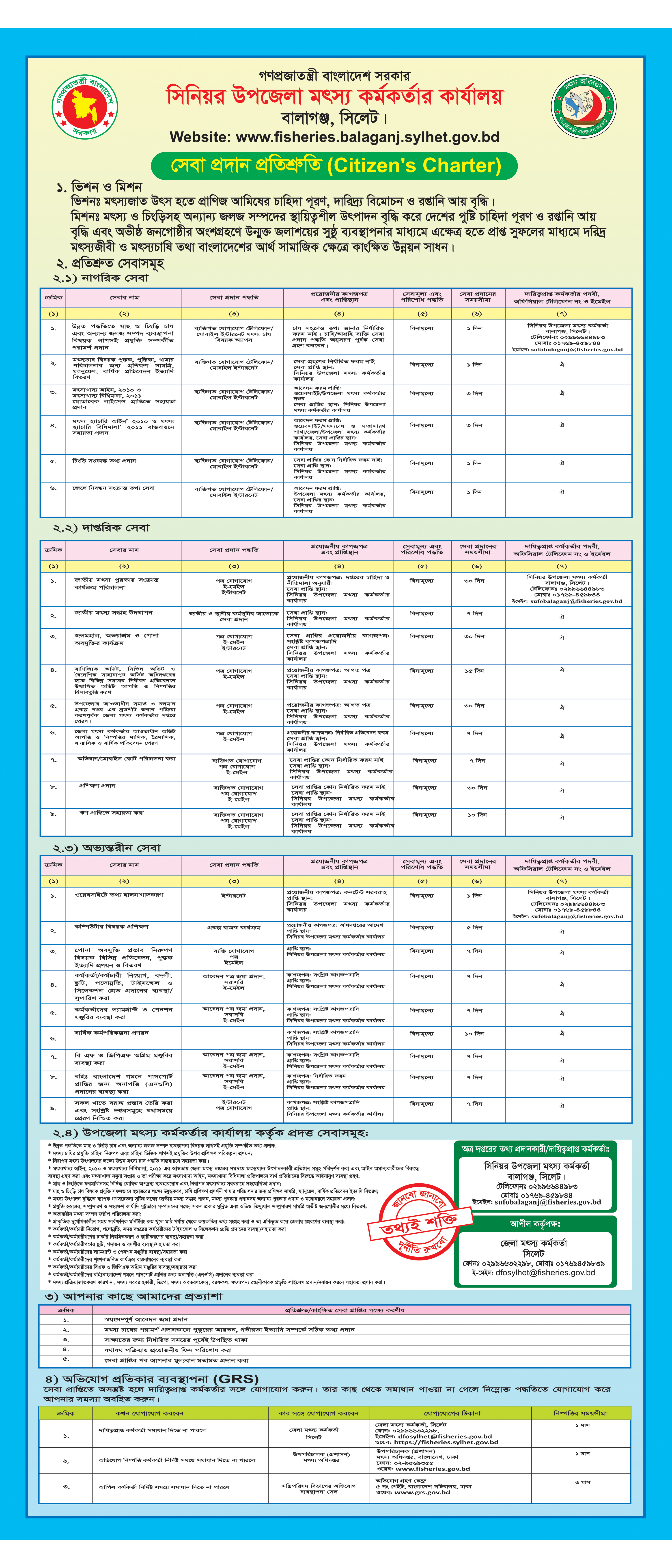 | ক) মৎস্য ও চিংড়ি চাষী এবং উদ্যোক্তাদের উন্নত প্রযুক্তি ভিত্তিক মাছ ও চিংড়ি চাষের পরামর্শ ও প্রশিক্ষণপ্রদান। খ) মক্ত জলাশয়ের মৎস্য সম্পদ উন্নয়নের লক্ষ্যে সমাজ ভিত্তিক মৎস্য ব্যবস্থাপনা কার্যক্রম পরিচালনা এবং মৎস্য রক্ষা সংরক্ষণ আইন বাসত্মবায়ন। গ) মৎস্য ও চিংড়ি চাষ উন্নয়নের লক্ষ্যে প্রকল্পের কারিগরি উপযোগিতা যাচাই এবং প্রকল্প প্রসত্মাব প্রণয়নে সহায়তা প্রদানের মাধ্যমে উদ্যোক্তা ও মৎস্য চাষীকে ঋণ প্রাপ্তিতে সহায়তা প্রদান । ঘ) উন্নত জাতের পোনাসহ মাছ ও চিংড়ি চাষের বিভিন্ন উপাদন উপকরণ সংগ্রহ ও সরবরাহে সহযোগিতা প্রদান। ঙ) উপজেলাধীন মৎস্য সম্পদের তথ্য ও উপাত্ত সংগ্রহ এবং উর্ধতন কর্তৃপক্ষেরনিকট প্রেরণ করা। চ) মৎস্য অধিদপ্তর কর্তৃক পরিচালিত উন্নয়ন প্রকল্পের অধীনে গৃহীত কার্যক্রম বাসত্মবায়ন করা। ছ) মৎস্য মাননিয়ন্ত্রণ ব্যবস্থা কার্যকর করার লক্ষ্যে মাছ ও চিংড়ি চাষে অননুমোদিত দ্রব্যের ব্যবহার বন্ধে চাষীদের উদ্ধুদ্ধকরণ এবং সংক্রমনের উৎস সনাক্তকরণ ও হ্যাসাপ কার্যক্রম বাসত্মবায়ন। জ) আহরণ উত্তর মাছ ও চিংড়ি অবতরণ কেন্দ্র/ডিপো পরিদর্শন এবং সেগুলোর পরিস্কার পরিচ্ছন্নতা রক্ষায়উদ্ধুদ্ধকরণ। ঝ) জনগণকে উন্নত প্রযুক্তি ব্যবহারে মাছ চাষে উদ্ধুদ্ধ করার নিমিত্তে নতুন প্রযুক্তি হাতে কলমে প্রদর্শনের লক্ষ্যে উপজেলা পরিষদ উন্নয়ন তহবিলের সাহায্যে প্রদর্শনী মৎস্য খামার স্থাপন। ঞ) মৎস্য ও চিংড়ি চাষ এবং ব্যবস্থাপনা বিষয়ে বিভিন্ন সম্প্রসারণ সামগ্রী চাষী / মৎস্যজীবিদের বিতরণ |